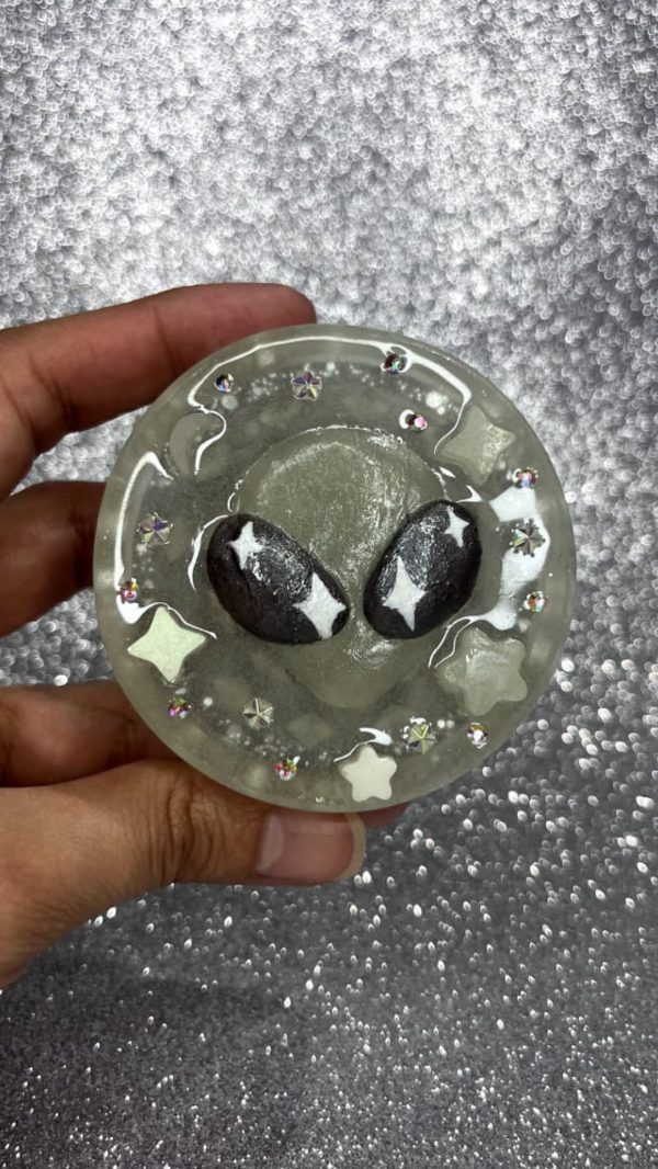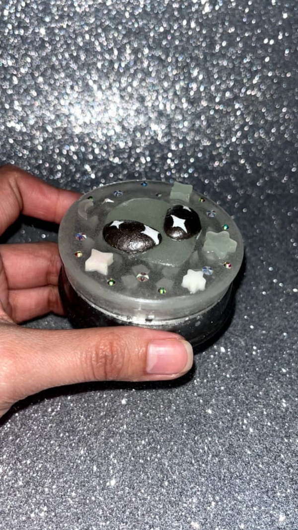 Hermosos detalles de strass, la fiesta empieza gracias al QR ( tiene casi 9 hs de musica Y2K) y brilla en la oscuridad.
